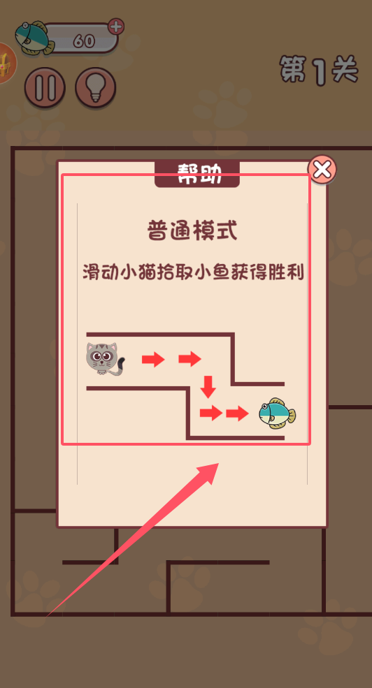 3、选择普通模式后,就来到了具体关卡,例如第1关。游戏目标通常很明确,比如滑动屏幕控制小猫移动。