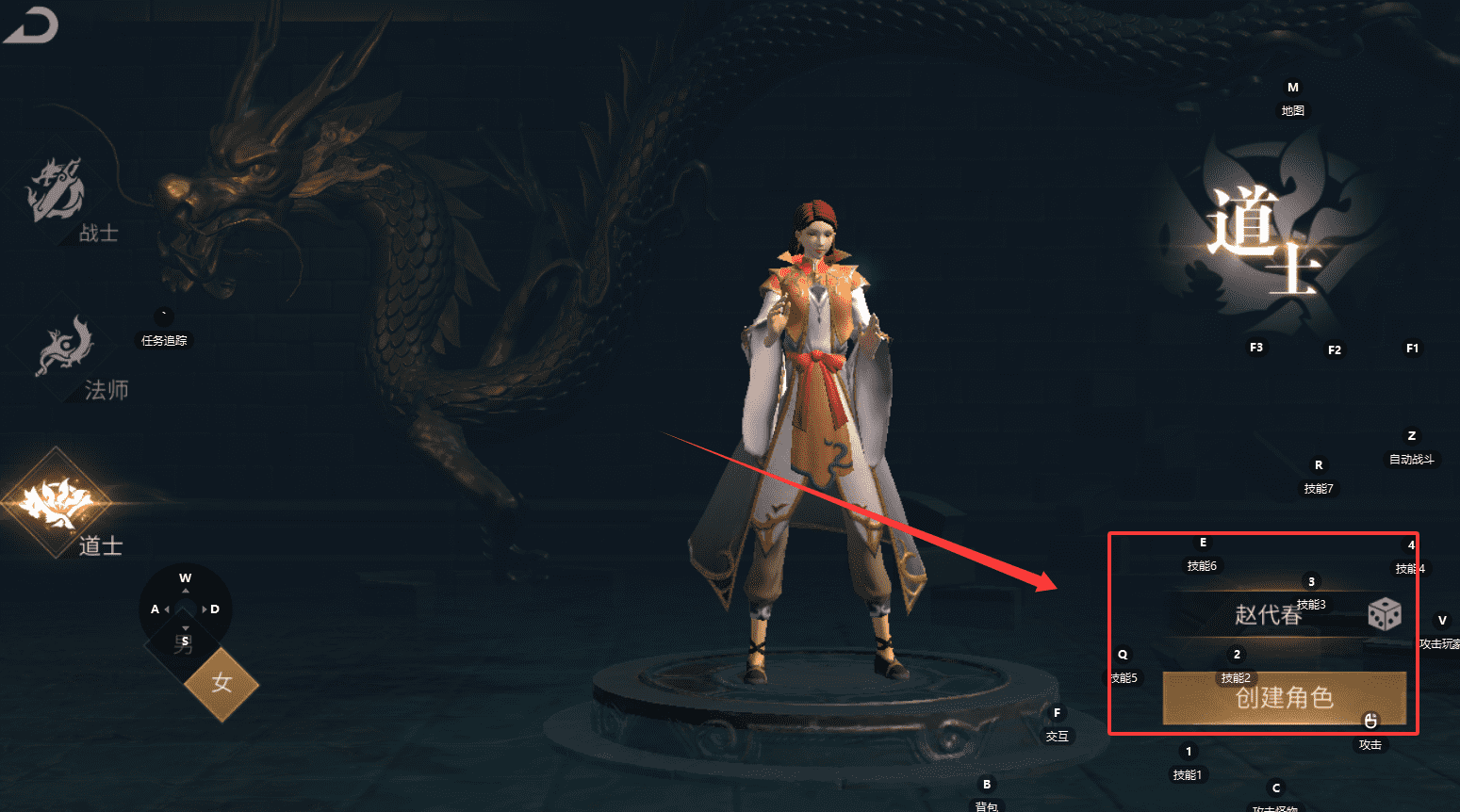 2、进入角色创建界面后,可以看到战士、法师、道士三种职业可以选择,选好喜欢的职业后,再设定性别和取名。