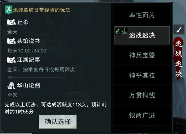 ④点开活动后的右侧有一个红底白字的 率性而为 系统为你推荐了各种选择的任务,如银两最多的玩法、铜币最多的玩法、PVP玩法、PVE玩法、可以挂机的玩法等一系列。