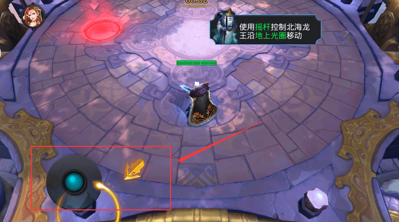 1、使用摇杆控制北海龙王沿地上光圈移动,这是基础操作的关键呢,你先看到屏幕左侧的虚拟摇杆,用手指轻轻滑动它。